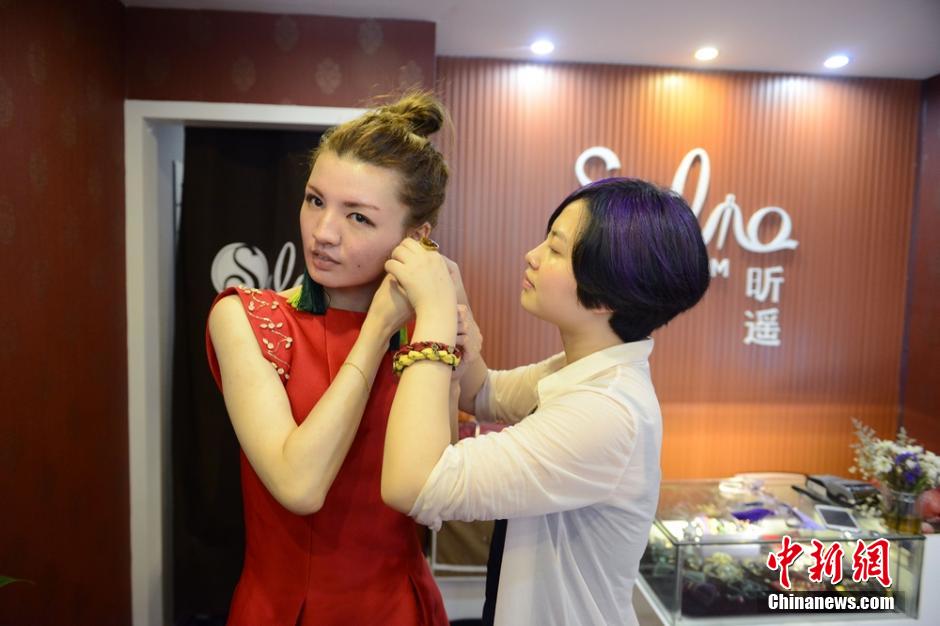 高级定制已经拥有百年的历史,由于受到皇室贵族、富商名媛等上流阶层的追捧而繁荣。而到如今,高级定制同样赢得不少市场消费群体的关注。5月3日,顾客来到长沙美女设计师李昕遥的高级定制店进行定制换装。李昕遥表示,店内的衣服定制价格从几千到过万元且无上限,高级定制风潮已逐渐席卷长沙,受到了众多消费者喜爱。图为李昕遥为顾客佩戴搭配耳环。 杨华峰 摄