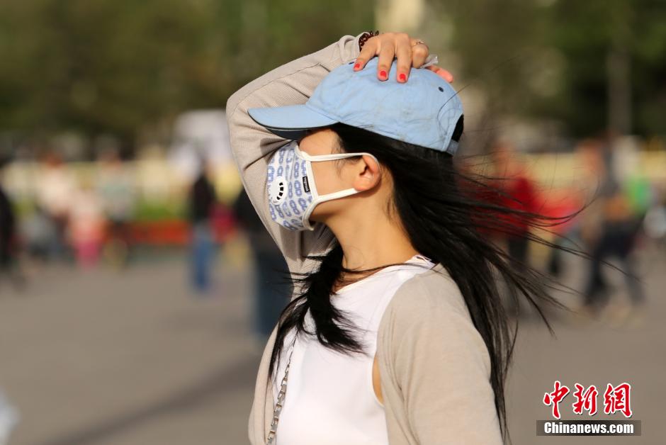 5月3日,游客戴口罩游览北京天安门广场。当天,北京市气象台发布大风蓝色预警,预计当日下午到夜间,北京市大部分地区将出现6级以上大风,阵风7-8级。中新社发 李慧思 摄