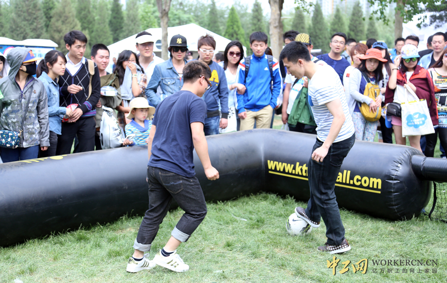 音乐节的现场的互动游戏和体育活动,也成为吸引年轻人群好去处,KT足球的1V1对抗赛也勾起了现场男青年参加的兴趣。图为两位青年1v1的对抗赛。 中工网记者 毛邓摄