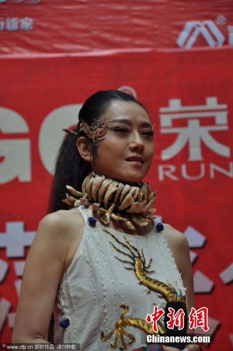 5月3日讯,浙江金华,3日,舞蹈家杨丽萍现身见面会。杨丽萍当天身穿印有金龙图案的白色长裙亮相,脖子上的似白骨项链配饰十分抢镜。