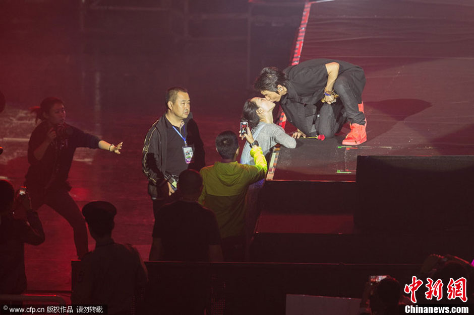 5月10日晚,南京,2014羽泉“开往春天的地铁”南京演唱会在南京奥体中心体育馆举行。白百何现身送老公羽凡激吻力挺。