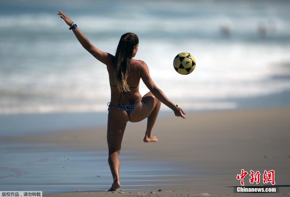 当地时间5月12日,巴西里约热内卢海滩举行冲浪比赛,一名美女身着比基尼在沙滩上踢球展示曼妙身法。