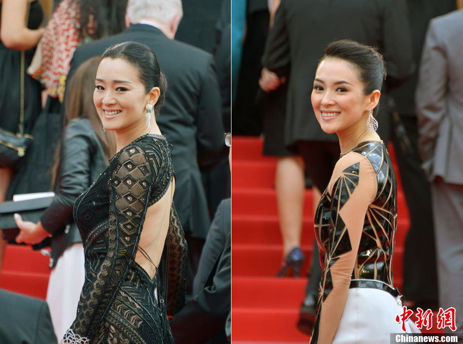 第六十七届戛纳国际电影节14日盛大开幕,随在电影节做特别展映的张艺谋新片《归来》而回归的巩俐身着黑色镂空长裙踏上红地毯,去年曾担任“一种关注”单元评委的章子怡也亮相开幕式,两代谋女郎在戛纳“斗艳”。中新社发 龙剑武 摄
