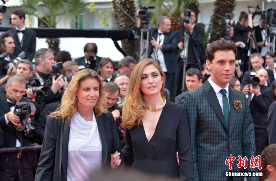 第六十七届戛纳国际电影节5月17日举行法国导演贝特朗·波尼洛执导的时尚界传奇人物伊夫·圣罗兰的传记片《圣罗兰》首映礼,法国女星茱莉·加耶(中)也现身红地毯,引来媒体关注。龙剑武 摄