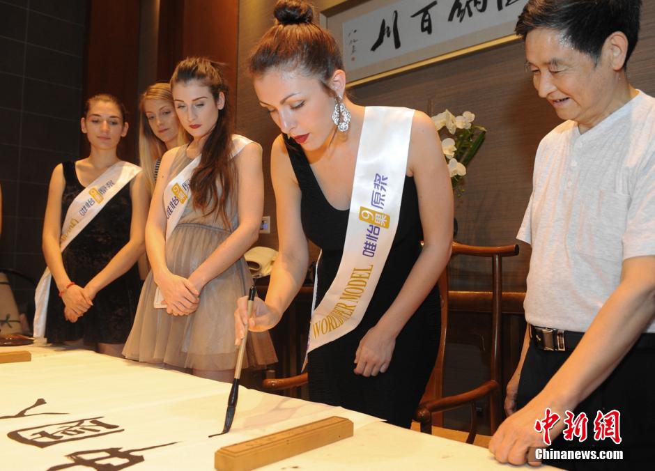 5月19日,2014世界超级模特大赛全球总决赛的佳丽走进成都东郊记忆星爱星艺术中心,现场向四川书画艺术家学习中国书画,学品功夫茶等,体验独具特色的中国书法和茶文化。图为超模现场向书法家学习中国书法。叶建 摄