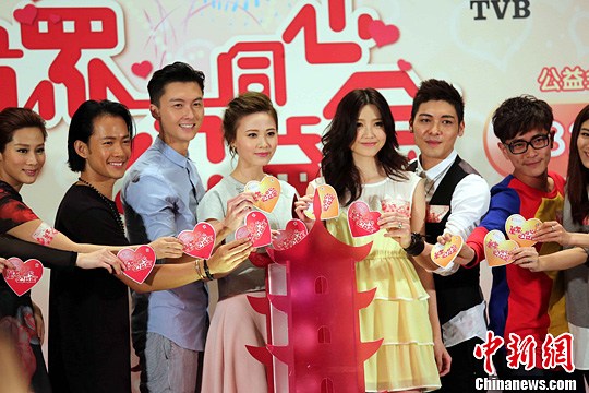 5月21日,香港无线电视为一年一度的慈善筹款节目《万众同心公益金》举行记者会。担任司仪和参与演出的艺人(左起)张嘉儿、敖嘉年、王浩信、朱晨丽、吴若希、罗孝勇、罗钧满等出席亮灯仪式。《万众同心公益金》将在24日晚举行。中新社发 洪少葵 摄