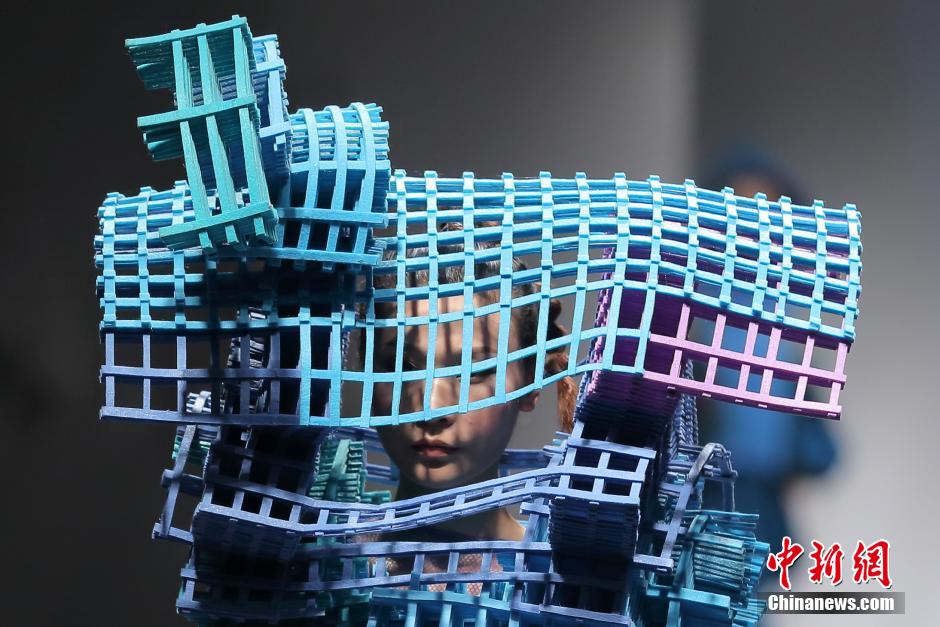 5月26日,模特专业的大学毕业生展示服装专业大学毕业生的设计作品。当日,南京艺术学院2014届服装设计毕业作品秀在该校体育馆上演,大学生们用无拘无束的构思突破了常规的束缚,勾勒出各种奇思创意,运用天然的棉麻材料、轻盈飘逸的欧根纱、真丝面料、前卫的牛仔等多种材质的混搭,完美诠释了传统与现代、经典与流行、文化与时尚的碰撞,在光影T台上美丽绽放。中新社发 泱波 摄