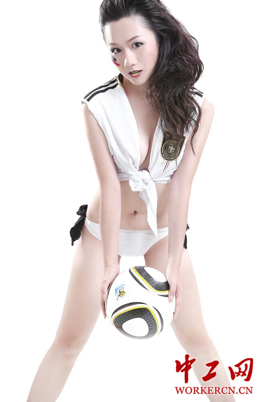 世界杯来了,足球宝贝们是怎么为足球型男们加油的呢?难道只有在现场尖叫才能算真正的呐喊吗?足球比赛给人带来欢乐,足球宝贝总是能让人眼前一亮,当然要是不展示出妩媚多姿的事业线就总感觉少了什么?图为:足球宝贝(模特)陈雅琼献礼世界杯。(摄影师:蝴蝶)