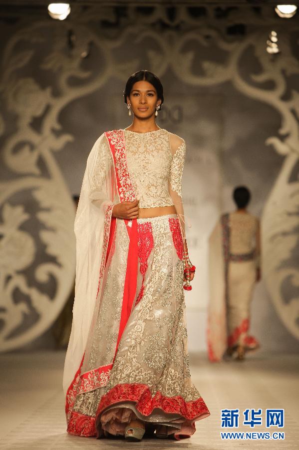 7月17日,在印度首都新德里,模特在印度时装设计周上展示设计师瓦伦的作品。新华社记者郑焕松摄