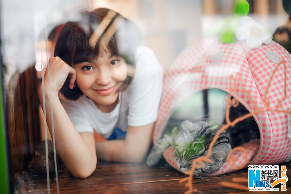 张佳宁与酣睡小猫纯真出镜 童趣写真清新神怡