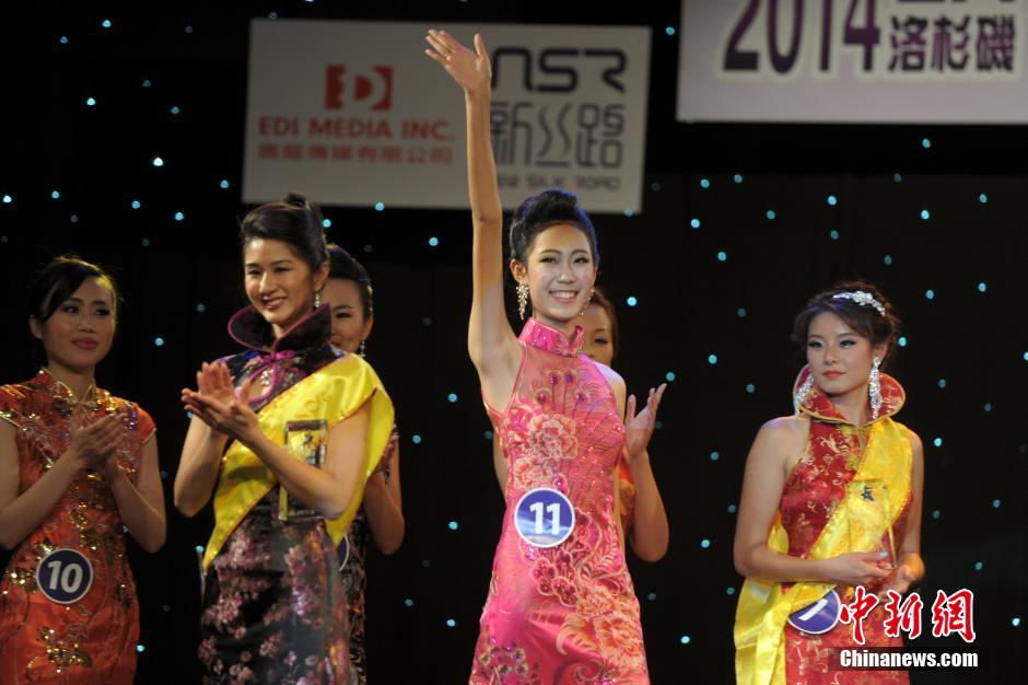 当地时间8月27日晚,2014洛杉矶新丝路模特大赛落下帷幕,12名进入决赛的选手分别进行了礼服、泳装、婚纱和旗袍的展示。最终,来自加拿大的16岁华裔女孩王东媛夺得冠军。她将代表洛杉矶赛区参加在中国举行的新丝路模特大赛总决赛。中新社发 毛建军 摄