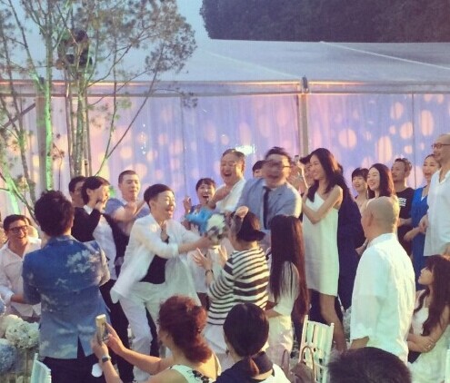 8月30日,娱乐圈大佬、华谊兄弟总裁王中磊在结婚20周年纪念日上与妻子王晓蓉补办婚礼。李冰冰、黄晓明、那英、冯小刚、张涵予、赵宝刚、汪小菲、林依轮等圈中好友都到场庆祝。王中磊的一双儿女也担当花童,林依轮、那英等人担当伴郎伴娘,而最终捧花被宋丹丹[微博]抢了去。王中磊在婚礼上对自己的发妻王晓蓉说,“20年前我拎着一个包娶走你没让你穿过婚纱,20年后我再给你披上婚纱。”