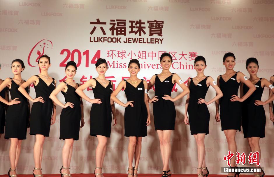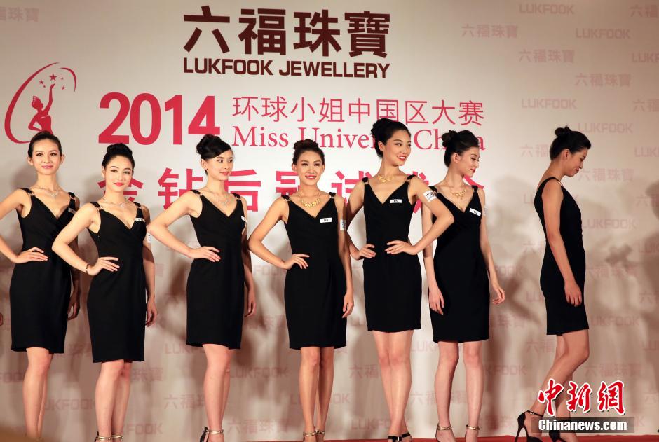 9月3日,2014中国区环球小姐15强亮相上海金钻后冠试戴会,佳丽们以精彩绝伦的首饰示范表演,角逐“最佳首饰演绎”殊荣。现场,2013年环球小姐中国区大赛冠军靳烨和环球小姐中国区总裁靳羽西,共同为佳丽加米拉(左三)戴上价值350万元的璀璨后冠。 中新社发 潘索菲 摄