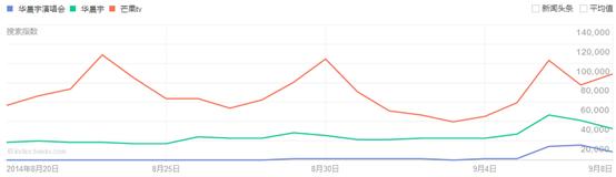 参照百度指数,网友使用芒果TV的最直接动因是收看湖南卫视的综艺节目,每个周末,快乐大本营、天天向上、爸爸去哪儿等节目都让芒果TV出现一次次的波峰。9月6日这个周末,备受关注的综艺节目配合华晨宇演唱会的在线直播,让芒果TV在当日的指数再度走高;且在演唱会之后的几日,芒果TV的受关注热度延续至星期一。芒果TV能够承受既有的直播节目同时,能够支持数万人同时在线观看演唱会高清直播,也反映了芒果演唱会前后,华晨宇演唱会以及芒果TV和华晨宇的搜索指数TV过硬的技术支持。