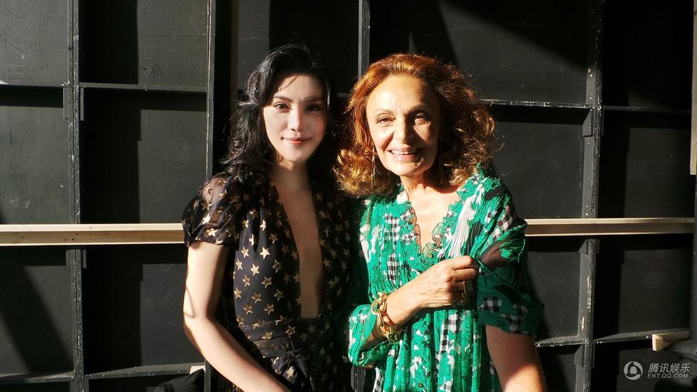 腾讯娱乐讯 华谊时尚女星韩丹彤现身DVF品牌秀场头排看秀,在该品牌秀场上,韩丹彤身着品牌服装,相比较之前看秀所穿的男装造型,这套DVF深V晚礼服配上美式复古发型,尽显出女人的优雅与魅惑,成为媒体的焦点并获得设计师Diane女士的赞赏。