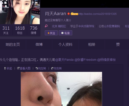 葛天曾在微博上和张睿多次进行互动,而一位微博名叫@肖天Aaran 的网友曾在2012年1月19号发了一条微博:今儿个逛恒隆,正在挑口红,偶遇天儿哥@葛天Panda @张睿Freedom @杨楠很神秘