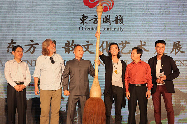 颇具传承意义的是,田七的学生——年仅13岁的辛衍,在老师的发布会上献出了自己的首部作品“辛衍诗集”作为致敬田七的礼物。这位被誉为“东方国韵文化传承人”的小伙子首本诗集从近年来创作的500多首诗词精挑出99首,加上田七亲自为其书写每首作品,近20厘米厚度的作品集让人叹为观止。活动现场,诗画优则导的田七,还给大家展示了其三部公益电影作品,这是“东方国韵文化艺术发展基金”的首期尝试作品,得到了张纪中、计春华等老导演、演员的一致认同与参与。“做传统文化的传承是公益,现代艺术中的电影也可以很公益”,田七的才华及公益心显然吸引了资本的关注。现场,纪中文化、千和集团、招银国金、中国康辉旅游集团代表与田七共同手握2米高的超级毛笔,共同启动了公益基金。