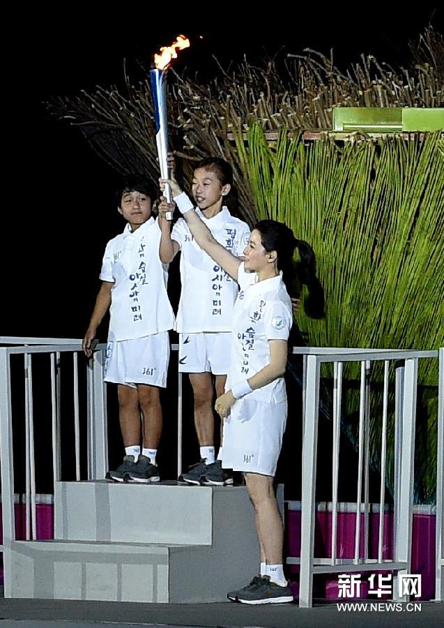 这是韩国著名演员李英爱(右一)在开幕式上准备点燃主火炬。 新华社记者王鹏摄