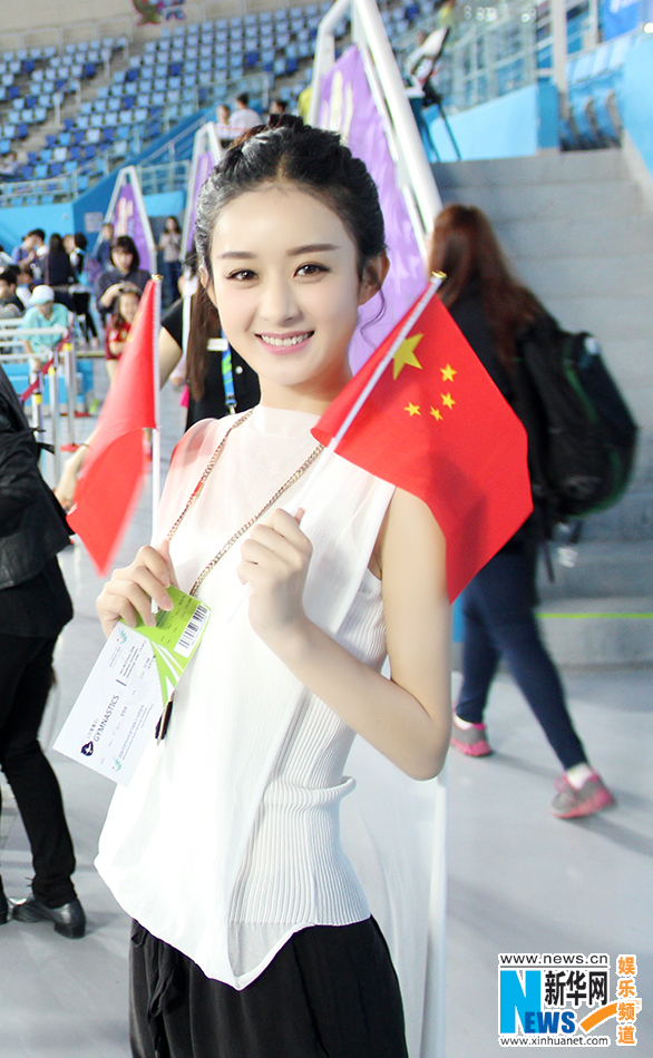 赵丽颖现身仁川为中国健儿助威 妆容甜美活力十足