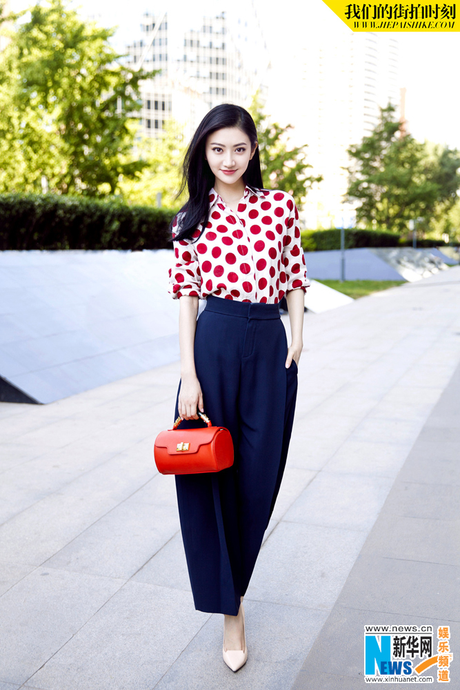 近日,景甜为《我们的街拍时刻》拍摄的一组初秋街拍曝光。照片中,景甜身着Burberry红色波点衬衫,搭配帅气藏青色阔腿裤,复古摩登,朱唇、衬衫、包包的红色配搭呼应,提升整体造型的柔美气质,更是显得肌肤如雪。