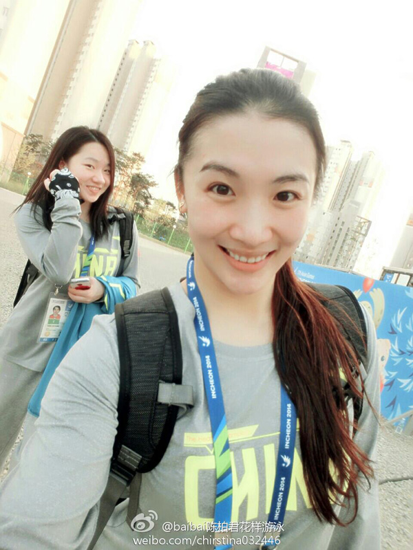 2014年9月22日,中国花样游泳队勇夺仁川亚运集体自由自选花游金牌,“花游女神”陈晓君自拍照曝光,网友直呼:真是“看醉了”。(图片来自陈晓君微博)