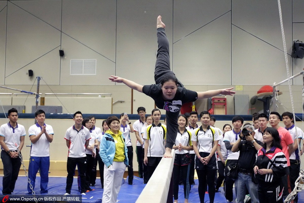 侧手翻、跨跳、倒立等连串动作,也难不到身材发福的程菲。26岁的程菲说,自己已经有很久没有再练过体操,有机会再示范感到十分兴奋。