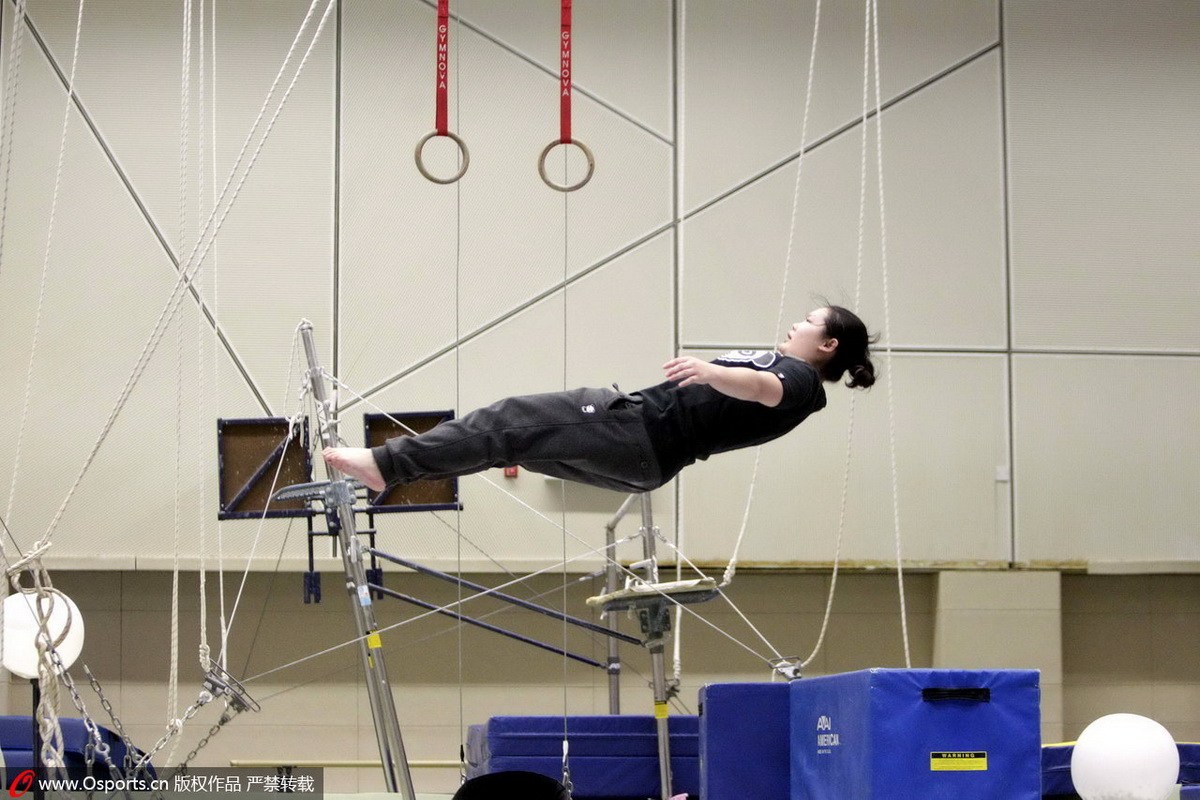 2014年3月19日,奥运冠军程菲造访香港,现场展示高低杠难度动作。