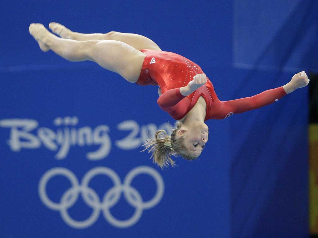 2008年北京奥运会,肖恩在高低杠比赛中。