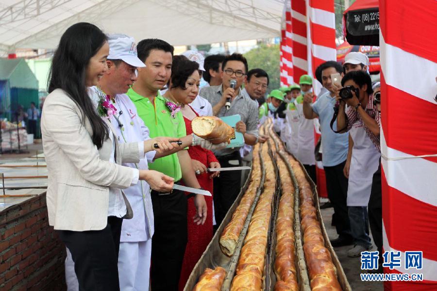 9月27日,在越南胡志明市,人们在品尝新鲜出炉的越南最长法棍面包。 当日,胡志明市一家超市成功制作出目前越南最长的法式长棍面包。该面包长达135米,使用面粉150公斤,由36名面包师花费3个小时烘焙制作完成。新华社/越通社