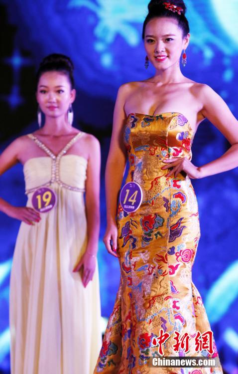 9月28日晚,2014国际旅游小姐菁英赛决赛在湖北咸宁赤壁市举行,来自深圳、湖北、湖南、黑龙江、河南、福建、四川、新疆等地的34位佳丽参赛,经过泳装、晚装等赛事环节角逐,来自西安的佳丽周怡含获得冠军、黑龙江佳丽李欣宇获得亚军、温州佳丽洪菲菲获得季军、图为参赛佳丽在决赛上展示风采。 中新社发 钱兴强 摄