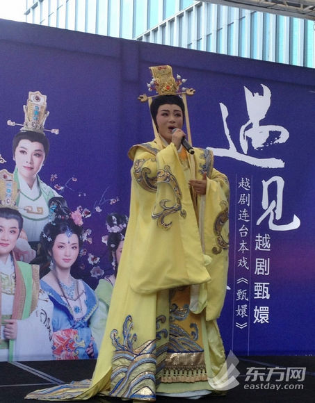 本越剧《甄嬛》中皇帝的扮演者——青年演员、“徐派小生”杨婷娜为现场戏迷表演剧中唱段