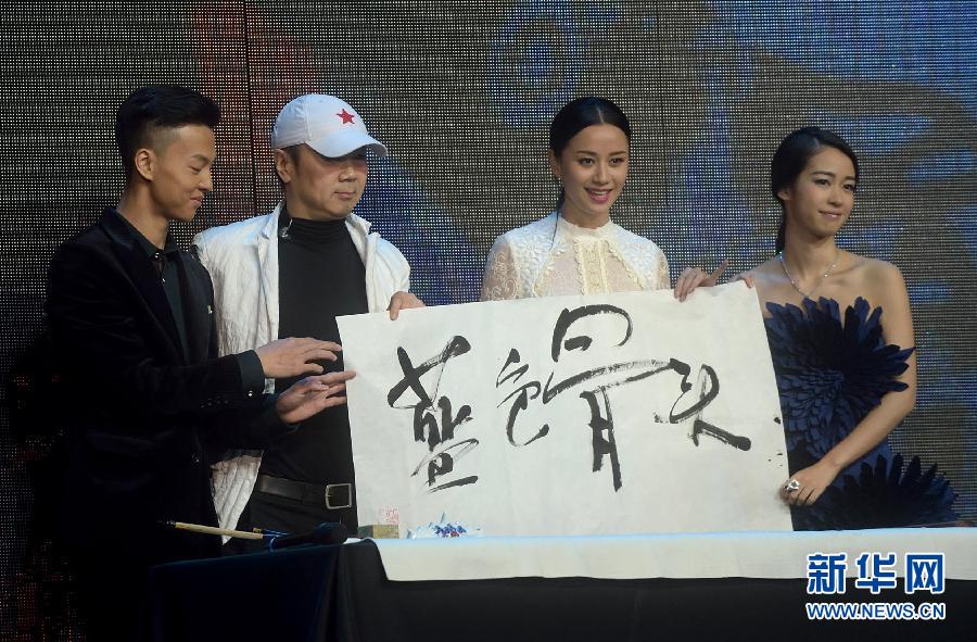 10月14日,主演尹昉、导演崔健、主演倪虹洁、黄幻(左起)在首映礼上展示崔健现场书写的“蓝色骨头”。当日,歌手崔健的电影导演处女作《蓝色骨头》在北京工人体育馆举办首映礼,毛阿敏、黄绮珊、李文琦等嘉宾来到现场助阵。《蓝色骨头》讲述了一个年轻地下摇滚歌手兼网络黑客与一位默默无闻的小歌手相恋,并偶然发现父辈旧日凄婉爱情故事。影片将于10月17日起在全国上映。新华社记者 金良快 摄