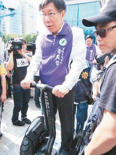 无党籍台北市长参选人柯文哲昨天为民进党新北市议员参选人黄俊哲站台,骑着赛格威电动车进场,大谈绿能政策。