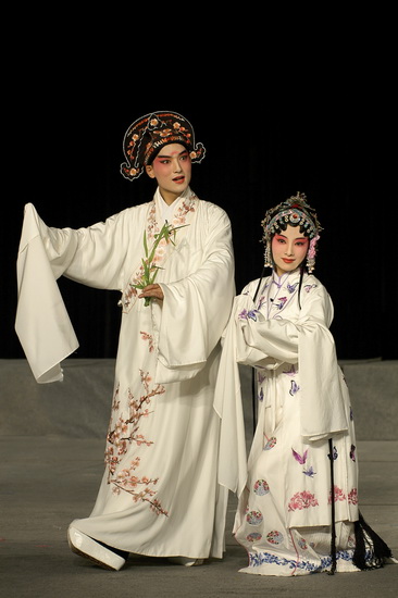 太精致的东西,往往似“旧时王谢堂前燕”,如何才能让它“飞入寻常百姓家”,白先勇做了很多尝试。早在创作初期,青春版《牡丹亭》几经易稿,只为既不改变汤显祖原著精髓,又能在节奏上适应年轻观众。众所周知,昆曲的曲调冗长,白先勇尝试将西方歌剧的音乐创作技法用其中,同时加入了大量的幕间音乐和舞蹈音乐,即使观众不专业,依然可以通过一颦一足的眉眼传情间感受到主角的丰沛情感。而观看过这出戏的观众无一不惊叹于它华丽精致的服装舞美,“真真是从画里走出的人儿”!在服装上,主创者做足了文章,总的基调定为苏州水乡式的“柔”,服饰材料选用丝绸并辅以手工苏绣,大量采用淡黄、粉红、嫩绿等主要色调,主画面为中国传统意象的梅、兰、竹等,愈发衬托出演员的古典美,大大推进了剧中至真至纯的爱情主线。而舞美更是别具风格,设计者将剧中传统的花神拿花舞蹈改成用十二个月不同的花来表现,用戏曲语言来舞蹈动作,让舞台的整个气氛随花神的独具特色表演流动起来。同时,利用“空舞台”的设置,最大限度拓展了载歌载舞的虚拟空间。舞台地板打破了传统地毯,利用灰色调地胶作舞台,还将现代书法家的优美书法运用其中,舞台景片上书写了唐代散文大家柳宗元的散文。