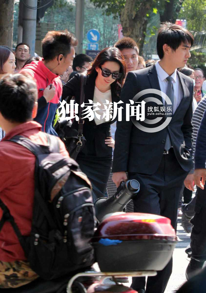 组图:刘亦菲职业装闹市拍戏 众助理帮整妆遮阳