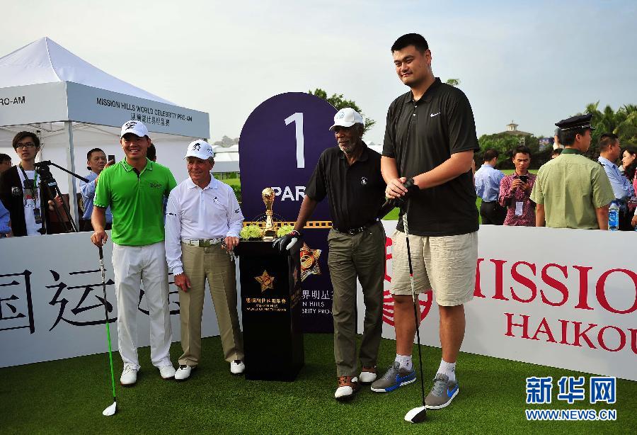 10月24日,姚明(右一)和好莱坞明星摩根·弗里曼(右二)在开球前合影。当日,观澜湖世界明星高尔夫赛明星职业业余配对赛在海口观澜湖黑石球场举行,24位国际高尔夫职业选手和24位国际知名文体明星挥杆赛场。新华社记者郭程摄