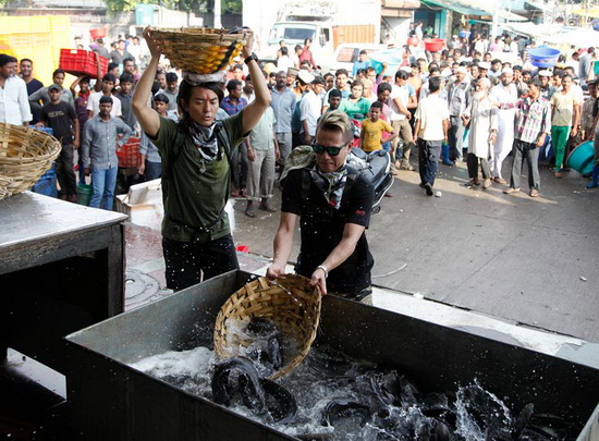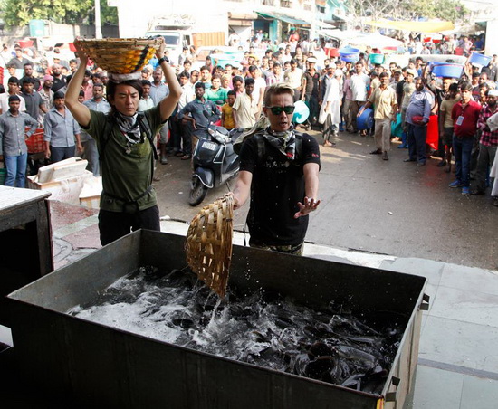 经过美国纽约和德州两站的激烈角逐,“史上最真的真人秀”《极速前进》飞抵印度站继续无底线的奇葩旅程。在熙熙攘攘的新德里鱼市中,选手需要将滑溜的鲶鱼从浴缸里捞出,头顶竹篮运送到远方。昔日叱咤风云的古惑仔竟被鲶鱼打败,面对鱼缸里扑腾乱跳的鲶鱼, 陈小春怕被溅上一身腥水连连躲闪,因为要把鱼舀进竹篮,善良的山鸡哥甚至边摇手边向鲶鱼道歉“sorry,sorry”十分可爱。
