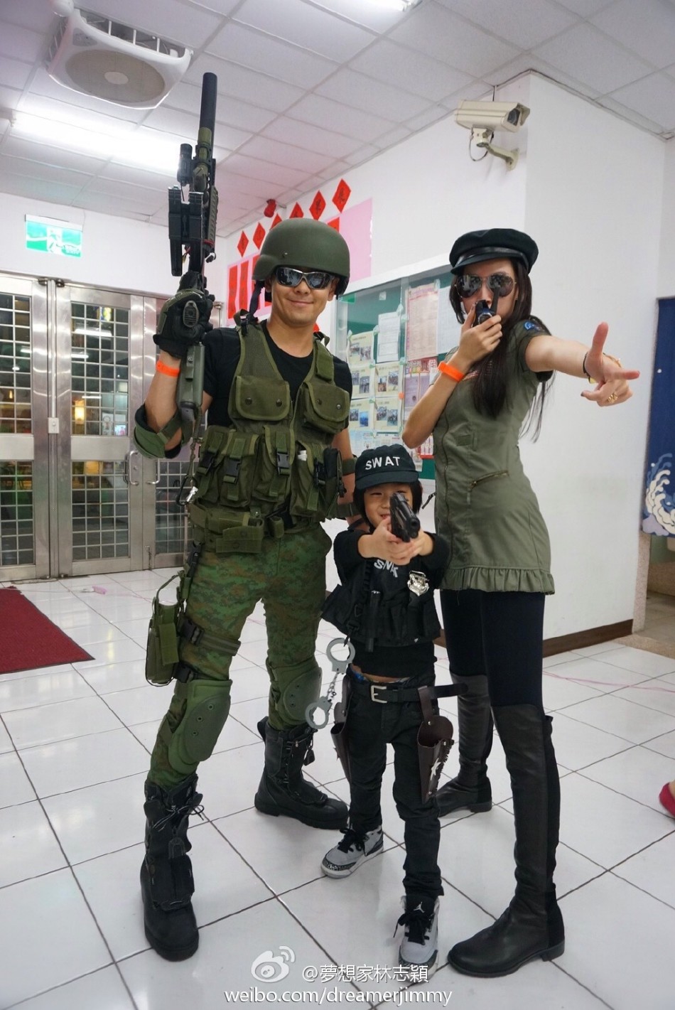 林志颖和妻子昨日参加儿子kimi学校的万圣节派对,一家人都穿着特警装扮。林志颖戴头盔,提枪,kimi则一身黑色特警装,手持手枪。