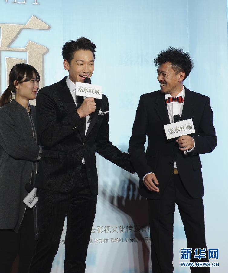 11月7日,电影《露水红颜》主演Rain(前左)、王学兵(前右)亮相活动现场。当日,电影《露水红颜》在北京举行首映及见面会,影片导演高希希携主演Rain、刘亦菲、王学兵等亮相活动现场。 新华社记者赵丁喆摄