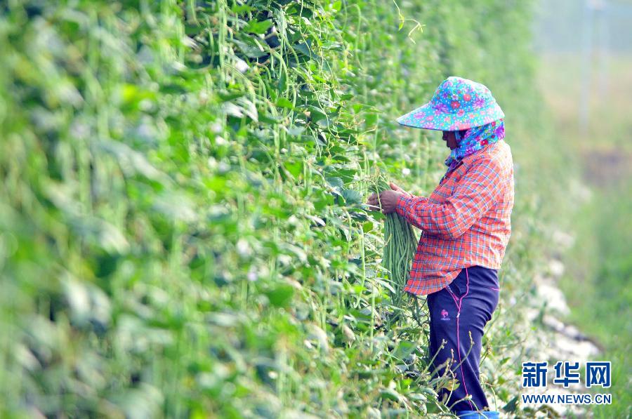 11月7日,海南省澄迈县永发镇后坡村经济合作社社员在采摘豇豆。当日是农历二十四节气中的立冬,各地农民抢抓时机及时收获农作物,田间一派繁忙景象。 新华社发(潘华清 摄)
