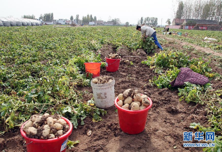 11月7日,山东滕州市界河镇李楼村农民在收获秋土豆。当日是农历二十四节气中的立冬,各地农民抢抓时机及时收获农作物,田间一派繁忙景象。 新华社发(宋海存 摄)