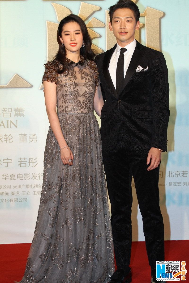 首映现场,刚刚从南京站转场北京的刘亦菲以一身金色礼服亮相发布会,秒杀菲林无数。韩国欧巴Rain则是在当天从韩国突然空降京城,让粉丝们惊喜不已。两人自从拍戏之后许久未见,此次再次相见于首映现场却并未生疏,赞美之词频出。Rain不时称赞刘亦菲是他见过最棒的女演员,专业又体贴,甚至透露第一次见到刘亦菲时,因为太漂亮了所以无法忍受,之前很努力地背的中文台词一下子全部忘记了,说到激动处更是用电影中台词“邢露,我爱你”来取悦女神。刘亦菲也是频繁表白,大赞Rain是他的偶像,非常聪明,台词一点都不忘,第一天拍戏时说的还是中文,偶尔她有时会临时改词,但Rain每次都会连贯的接上,虽然语言不通,但两人凭眼神就可以流畅沟通。