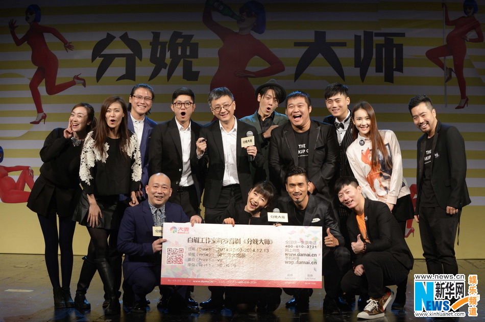 足了功夫,无论新演员的挑选还是具体到某一场戏,他都亲力亲为的参与。用他的话说,“每一个表情、每一句台词都要对的起这个舞台。”作为出品人,邓超更是忙前忙后,除了操心艺术质量,还要考虑市场反馈。邓超对《分娩大师》的票房颇有期待,面对主创邓超也放出狠话,“话剧表现好,主演顺利加盟新电影计划,如果话剧差强人意,就要考虑大换血。”此言一出,主创团队却反映淡定。毕竟,想要再凑齐这样一群“深井冰”还是颇有难度。所以,大家除了积极彩排、卖力演出之外,对于出品人的“威胁”似乎并不在意。在电影《分手大师》中有着上佳表现的“大师”梁超直言,“我们是专业的喜剧演员,舞台就是我们的家。你想想,观众来我们家里,我们能不好好照顾他们吗?所以,请邓总和观众放心。欢迎大家12月3日来我家做客。不过,我们搬家到梅兰芳大剧院了,别走错了!”(摄影/雷图)