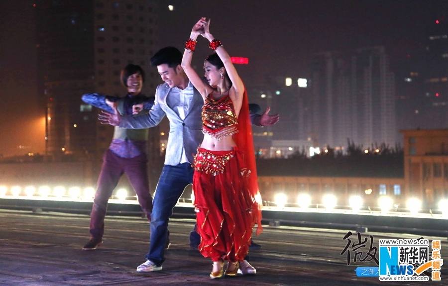 Angelababy不惧严寒穿肚兜 披红纱天台跳肚皮舞