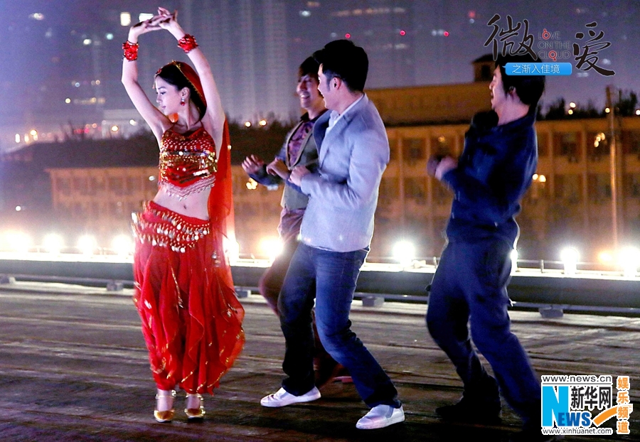 Angelababy不惧严寒穿肚兜 披红纱天台跳肚皮舞