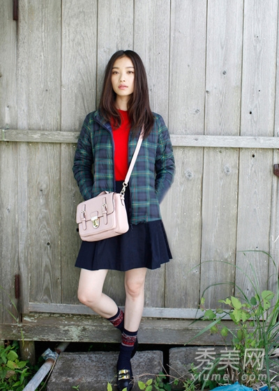 格外可爱清新的日系服饰搭配,倪妮穿着格子短外套内搭红色打底衫,下穿藏蓝色短裙,搭配棉袜和小皮鞋,背着粉色挎包,俏皮活泼的少女系装扮。