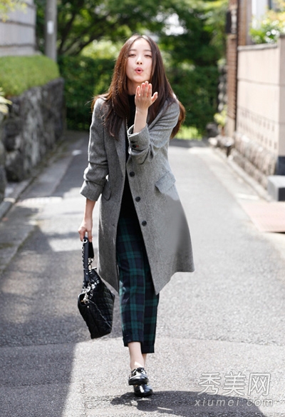 很有日系OL的感觉,很适合上班族的打扮,休闲中不失干练优雅味道,深灰色长外套内搭黑色打底衫,下穿格子九分裤,搭配黑色皮鞋,拎着菱格手袋,美丽动人。