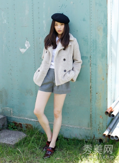 毛呢外套内搭白衬衫,下穿深灰色高腰短裤,大秀美腿,搭配皮鞋,潮范儿十足,很有时尚感,搭配小礼帽,更加吸晴。