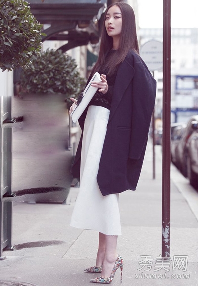 将黑色长款西装外套搭在身上,内搭黑色渔网上衣下穿白色长裙,搭配彩色图案高跟鞋,如此高雅干练的女人味搭配。
