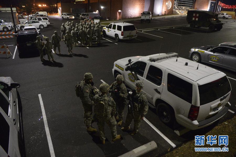 11月25日,美国国民警卫队队员在密苏里州弗格森警察局外和抗议者对峙。美国密苏里州圣路易斯县大陪审团24日晚决定不对枪杀非洲裔青年迈克尔·布朗的白人警察达伦·威尔逊进行起诉,在多个城市引发抗议活动,弗格森地区更发生包括枪击、抢劫、纵火在内的暴力骚乱。25日,密苏里州在弗格森增派1500名国民警卫队队员维持治安。新华社记者 殷博古 摄